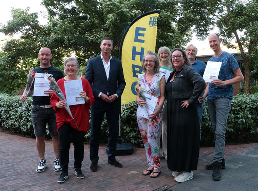 Daarna volgde de uitreiking van de EHBO-diploma's aan de 11 cursisten, die de basiscursus EHBO hadden gevolgd, door de trotse instructeur Ellen Kamphorst en de felicitaties van de burgemeester. Het bezoek van Bram Harmsma werd afgesloten met een fotomoment samen met de nieuwe EHBO-ers. Bram ontving van onze voorzitter een ANWB Familie Plus EHBO Verbanddoos om zelf ook aan de slag te kunnen.